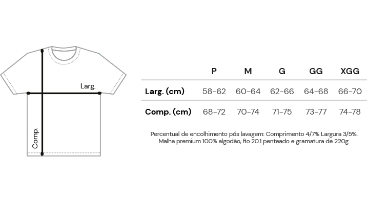 Composição: 100% algodão, utilizando fio 20.1 penteado e uma gramatura de 220g, com gola encorpada em Ribana